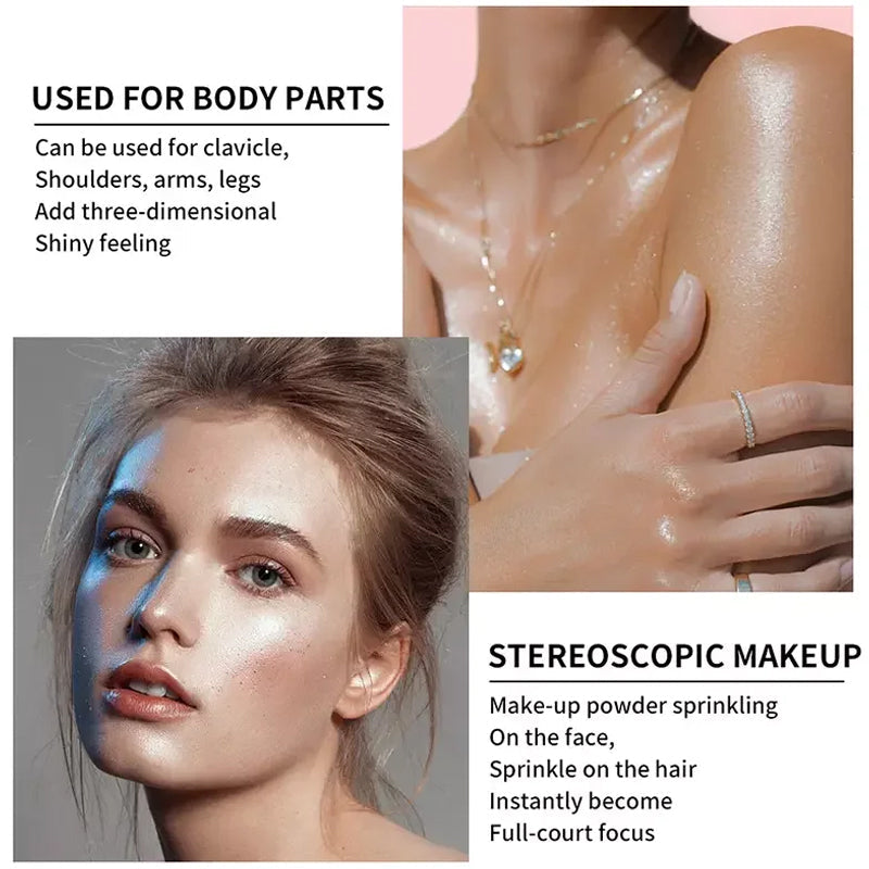 La combinaison parfaite entre une houppette et un enlumineur, facile à appliquer, texture légère, peut créer un effet maquillage brillant longue durée, peut être utilisé seul ou en combinaison. Donne un look brillant. La brillance éblouissante vous permettra de vous démarquer en toute occasion.